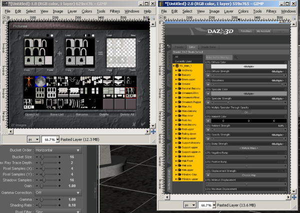 Top screenshot pair is Bryce image library on left, DAZ Studio Surfaces tab on the right. Before using Texture Atlas.