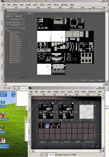 Bottom screenshot pair is the Bryce image library after using Texture Atlas (note condensed images), and one of the Texture Atlas windows showing the list of materials that you can modify.