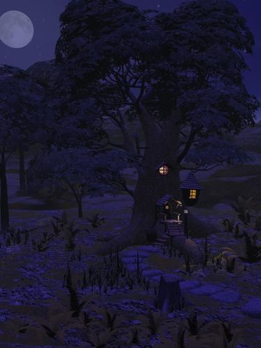 Here is an image with The Heart of the Forest for the Multiplane Cyclorama and the aged wood textures on the tree house.