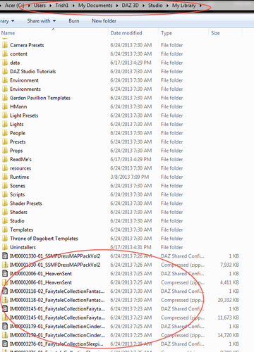 It looks as if you have downloaded the zips to your My Library folder but not installed them - or possibly you unzipped them there manually and that's why you have a Content folder in My Library (you shouldn't - try selecting everything in that folder, cutting it, going back up to My Library and pasting).