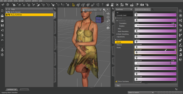 Can someone tell me the diferences between 'smoothing iterations' and 'collision iterations' in the parameters pane, and when you should use each? Very often they don't seem to be able to cope with problems. The attached test render is a case in point. This is a genesis figure, with 'Summer Dress' FOR GENESIS. So if it's a Genesis fit, why doesn't it fit Genesis? This is in no way an extreme pose, just with one leg in front of the other. The lower part of the dress is defying gravity, seemingly just lining up with the orientation of the hips. No adjustments are available to bring the left leg forward on the dress, and I've ramped collision iterations nearly up to the maxiumum (before I did that, her leg was showing - afterwards, there's this weird green lump on her leg). I've tried smoothing iterations as well, but it's no better. I've never tried weight mapping but could that help?