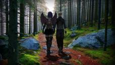 This is a composite image. The forest background was from a royalty free wallpaper site. The characters were rendered in DAZ using iRay and then I composited them together using GIMP. I am just super happy with the way the whole thing turned out.
