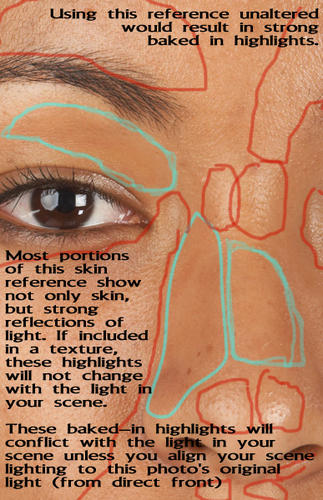 I know that I personally will never make a skin with heavy baked-in highlights for this medium, because they are in full conflict with other features I use and find considerably more valuable -- like SSS and proper use of various forms of specularity -- that are available in both DAZ Studio and Poser. (Telling me to do this is like telling me to take a horse and buggy to the grocer's rather than a car.)