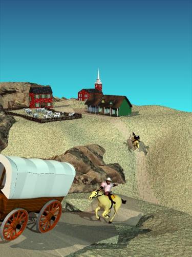 Title: West of the Planet of the Apes. Work in progress. From the objects browser, I fitted the golf shirt, cowboy hat, and gunbelt to the ape. I rigged the ape and posed him atop the galloping horse. Just at the concept stage. Other stuff from the content browser include some buildings, some plants, the fence, the bench, rocking chair, and some plants. Oh, and of course, the rhino disguised as a cow (and replicated). It is a tough call between completing this spoof of a Planet of the Apes movie poster, or completing a stampede of armadillos.