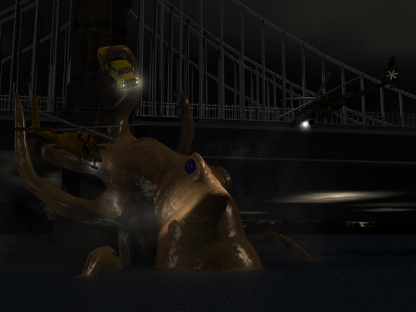 I used a couple helicopters from the Aircraft directory, the Brooklyn Bridge from the Landmark directory, the School bus from the Transportation directory ( could have been New Models) and the Octopus from the Mesh Models (I think) directory. I'll check my directories later. I added my own atmosphere and clouds. Not sure if this counts as content, but for the ocean I added an infinite plane with a custom water shader.