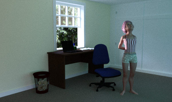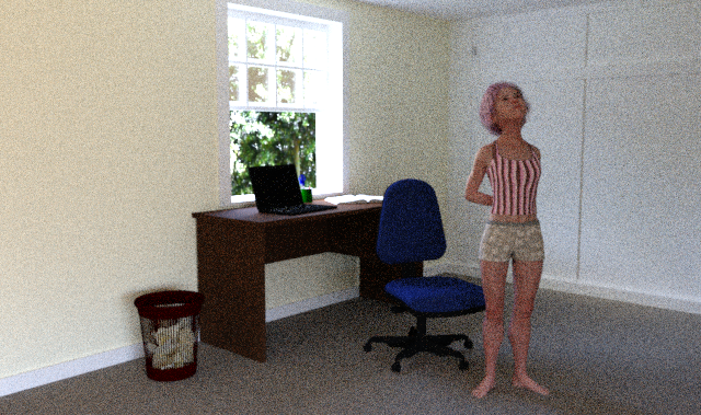 What would the ceiling look like if it was included in the render? Would it glow? I have some sets where the windows are emissives and NOT made of any glass material. It would appear your suggestion is using that same system to make a "fake" light source inside the normally darkened room. BUT! There's no beams of light, like a godray. And the shadows are not too strong.