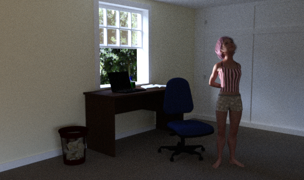 Besides question if i should have let it run much more, 'd like to ask advice about lighting this scene.. There are two lights here, one from window (i think it's emissive surface? mesh?) and another one is spotlight i put in front to light up character.