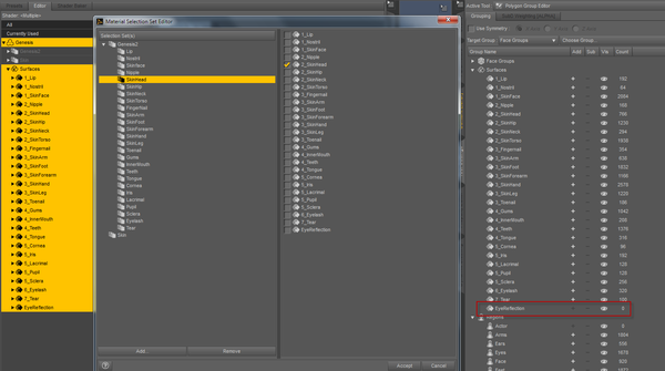 A little trick for the eye reflection would be to use the polygon group editor to add a surface named eye reflection without anything in it for Genesis