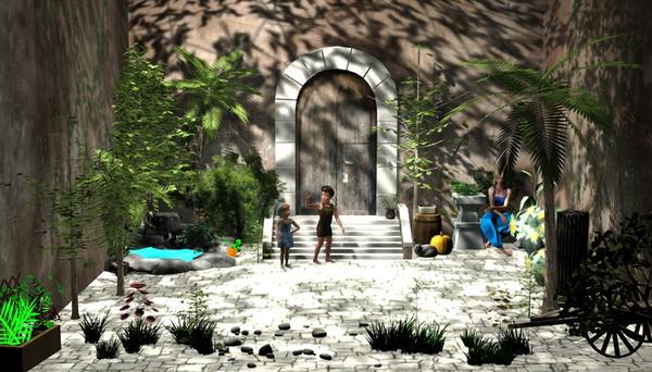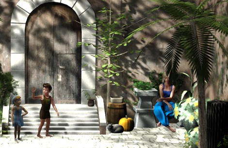 Regarding my own, it was really entertaining to work entirely in freebies. I tried to recreate a Mediterraenean villa's courtyard where the inhabitants tend to relax. There is no roof, but a wooden crossed canopy that casts the nice shadows (I used Dyald's lights for that effect). There are vines growing on it whose silhouettes can be seen from below. I imagine we're looking at the scene from a niche opposite to the door; that's why the grass and other plants near the lower parts of the image are darker than the others, they are overshadowed by the niche itself. The courtyard itself is arranged in a loose, asymmetric manner. There are some old objects that are no longer in use, for instance that old wooden cart on the right or the barrel. The woman silently keeps an eye on two kids playing in the centre of the image near the stairs and a decorative pond. I have another picture where also portrays a Vietnamese piglet bathing in the pond, but it was a limited time freebie from Most-Digital-Creations, so I could not link to it and had to remove it from the final image. I'm afraid not all of the plants are very realistic, but I wanted to use a wide variety of them, so please excuse me. The apple is barely seen from the distance, but it rests in the basket on the right side of the woman. I'm also not entirely satisfied with the bright colours of the plants from Petra and a small herb crate on the left side of the pond, but texturing it again would have taken ages. Still, I was amazed by how many freebies I put into use for that work :).