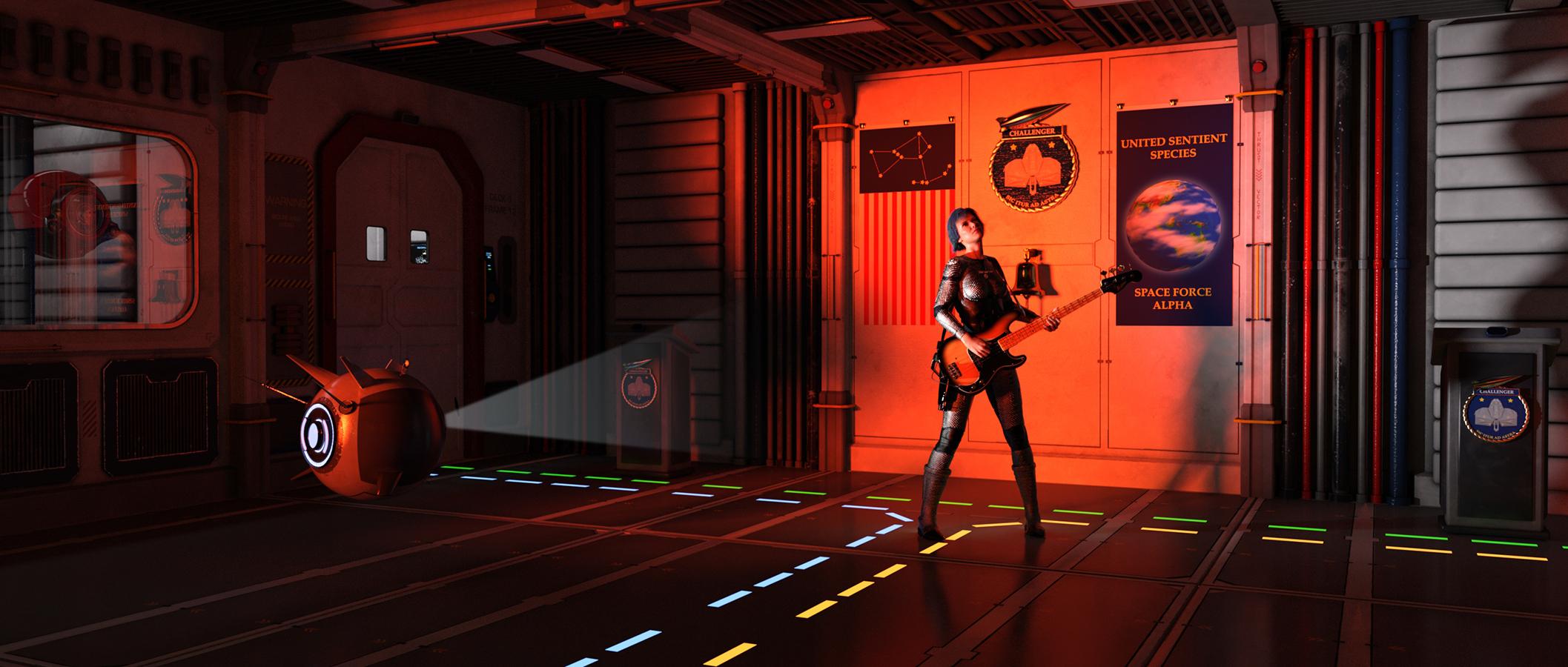 I was playing around with the reverse angle - lighting the set from outside with one of KindredArts' space HDRIs, and rather liked the way it lit up the back wall. I had to crank up the intensity somewhat though. I rather liked the idea of having a bot looking out of the window instead of a person (Stonemason's Recon Drone, and 3Anson/Forbidden Whispers Devastator Drone), and extended that to having the bots watching the guitarist. A single spotlight, parented to the bot was used to highlight the bass player. The light cone was added in post.