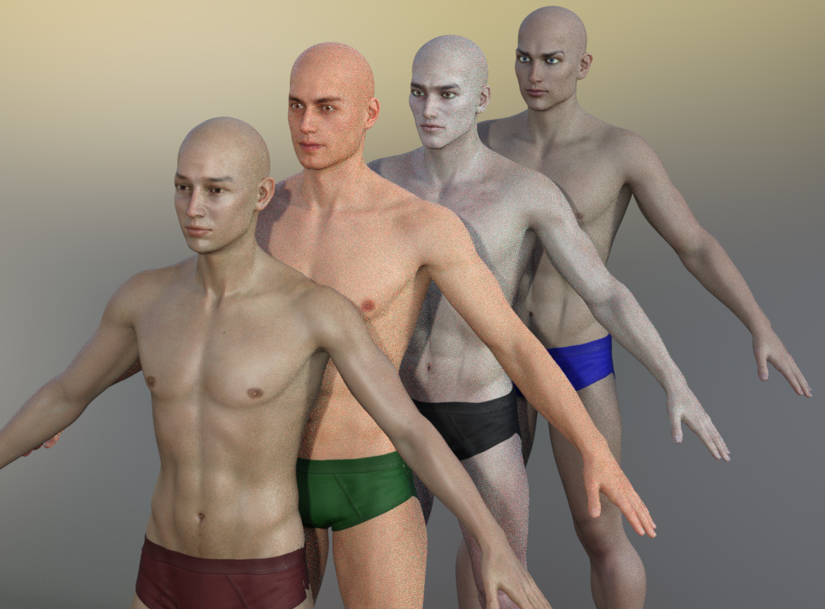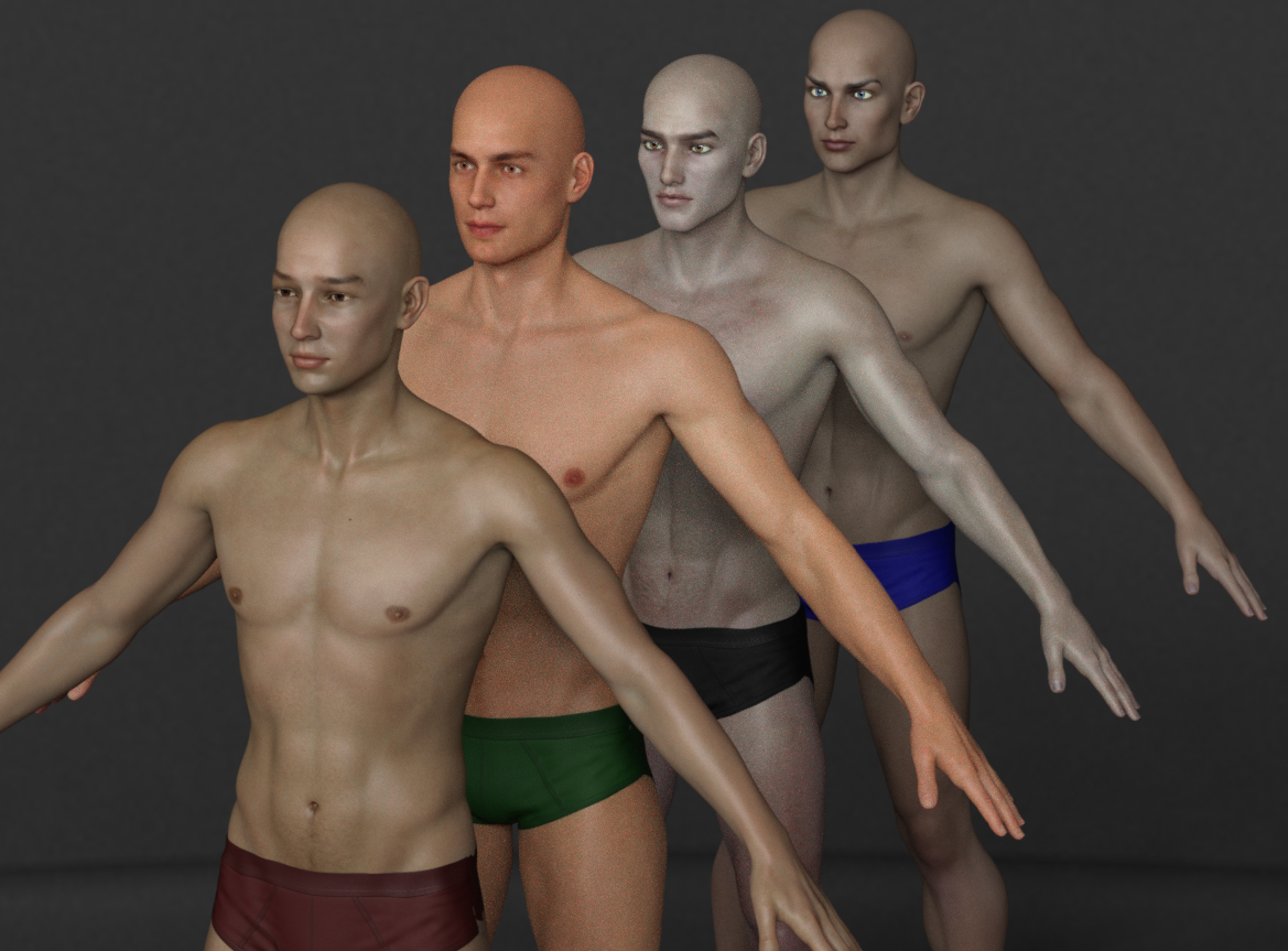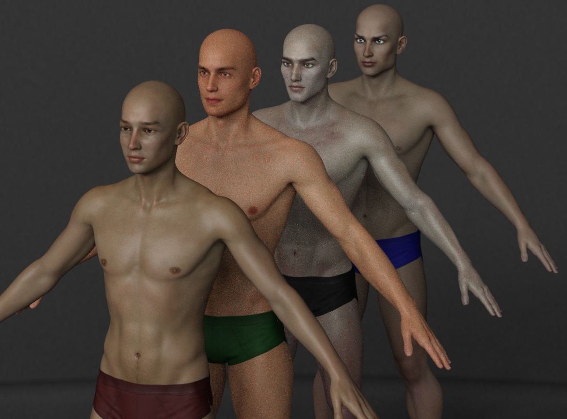 Okay-so here is one render. Default render scene/render options except that I turned the environment done on. I did keep the camera headlamp on so they could be seen better. From front to back: Stryker, Michael 8, Kyle, and Christian. He is definitely pale (I went with a skin tone pretty close to my own here) but there are tonal qualities that vary within the skin.