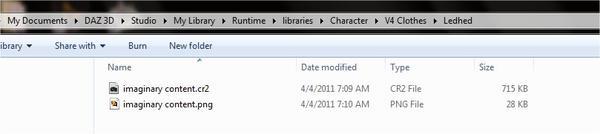 So let us say you created a V4 clothing item and gave it way free the CR2 or Duf files and any picture thumbnails that go with it would go to My Library/Runtime/Libraries/Character/V4 Clothes/LedHead/ So when I look in the Content Management tab in DAZ I know if i want to use some V4 Clothing Item I should start by looking in that folder.