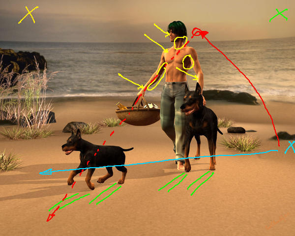 @ Kesh - I did understand so no worries, english isn't my native language either truth to be told *smiles* Now.. as for the yellow marking, the light that was there was used to soften a little as Kielan and Graip (adult dog) looked a bit too dark in my eyes, without any shadows active as it was only a fill light so to say. The one you marked as blue, is approcimately where my main Spotlight is, the one that gives the stronger shadows. I did move it a little as per your advice, but I didn't like it where you put the red marks so it only got moved a little bit *smiles* the one you marked as green, is in approximately that area, slightly lower. and it's a area light plane, only used to give more natural shadows to the plants. The angle is different since the main use for that plane is for the plants, but a little of it do end up on Kielan as well, though if I change the angle of the plane it gives the plants shadows that doesn't match the rest of the light/shadows.