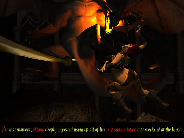The poses of Kielan and the pup has been tweaked a bit from the original, the pose on Graip (the adult dog) is made from scratch. Lighting also made from scratch (consist of 1 distant, 5 spotlights, 1 area plane light and UE2 ambient), varying intensity and colors. Kielans pants using one of my photos as texture. Kielan himself is a character I morphed for the morphing contest Scott held.