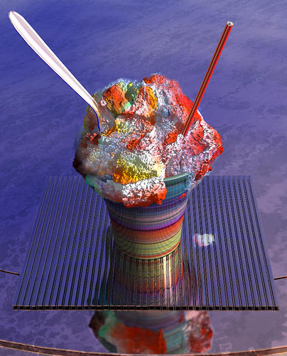 Savage...I chanced putting a slightly larger-sized copy of the ice-cream obj on top of the original ice-cream obj, and then changed its mat to one from the Atmospheric cloud mats (gave it some transarancy, too) but it really didn't work.