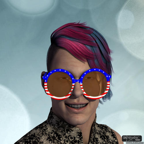 I'm not sure what you mean, exactly. The Chibis don't have a style that is specific to them, the glasses are the same on all characters. The only difference is that the Chibis enormous heads don't leave much room for morphs, so SPEX won't change much when morphs are dialed in. To get around that, I would use SPEX2, which morph just fine once they are sized to fit the head. As far as creating Elton John's style, you can make such a thing by using the various shaping morphs. And since "regular heads" are not so big, it would be much easier than the Chibis. There is a "Frames Round" option, as well as a "Frames Thicker" option, which combined should do the trick. Then, a custom texture would really bring it together. SPEX actually comes with two UV mapping options, one that is great for tiled textures such as camouflage (included) and another for planar mapping, such as the Stars and Stripes that Sam is wearing. Of course, you can use different mapping on each of the 5 different material zones on the frames, such as planar for the round parts and default (tiling) for the arms.