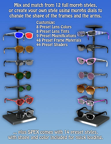 So, what else do SPEX do? SPEX and SPEX2, the smart prop version, both come loaded with morphs to change the shape and style of your glasses, including 12 dial-spun shapes, 5 arm styles, and 12 morphs to change the dimensions of your frames. Special posing morphs allow adjustments to make that perfect fit.