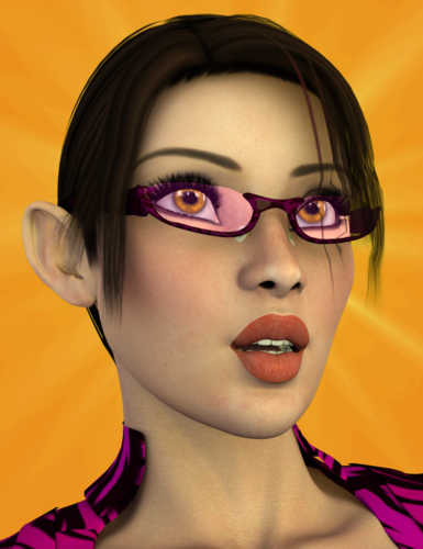 I should've mentioned previously that her glasses use the "Giraffe" shader with a purple diffuse and the upper part of the frames are invisible. I think her shirt was Tiger 2 with pink diffuse. I still need to tweak the glasses some more, but I'm happy with what I've managed to make in an hour. I might as well post a screenshot of my current settings in case people want to recreate a similar one. I also gotta go make new random ones just because.