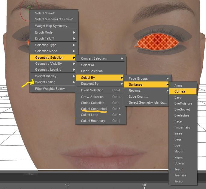 Right click, viewport-Geometry Selection-Select by surfaces-Cornea (Cornea, EyeMoisture, Eye Socket, Irises, pupils, Sclera, EyeLashes?)