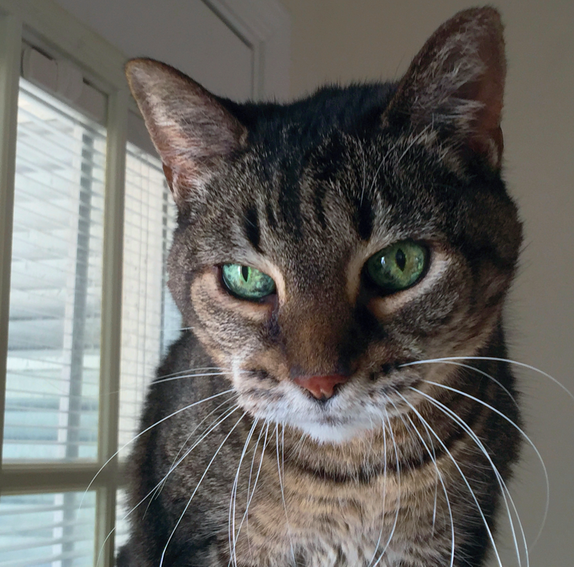 @melaniel Okay, I had to go to my computer external hard drive to find a good photo of Holly, I'd taken thousands of pictures off my iphone because I literally filled it up! I wanted to show one taken in January, when she was on top of the kitty condo in the master bedroom. She leaned forward and trilled her usual "Brrrrowwww" and I thought her eyes were so pretty. I asked the vet on Friday if the rimming inside the eyes was due to a hemorrage or something, and he said no, it was just old age. Holly always had the most beautiful, vibrant green eyes of any cat I've ever owned.