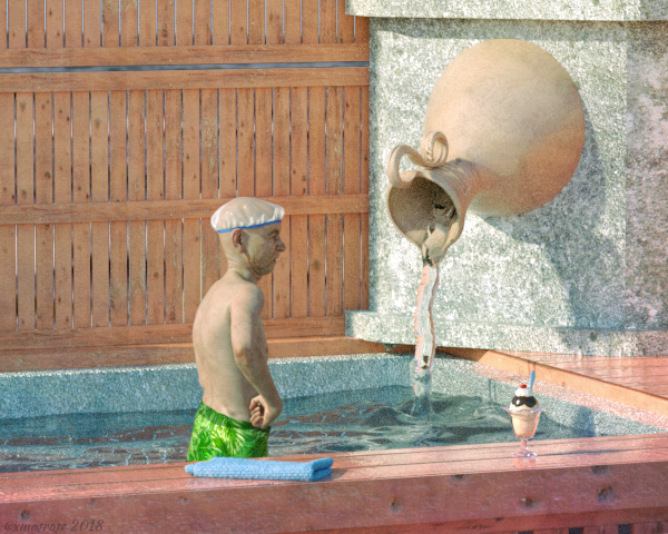 A really quick one. My latest purchased figure is Floyd, my latest clothes are female so, instead, I put a towel from https://www.daz3d.com/the-werks-mega-prop-pack with shaders from https://www.daz3d.com/uhd-fuzzy-cloth-shaders-and-merchant-resource both recent purchases and the last environment is https://www.daz3d.com/fountain-collection-for-iray with MEC4D shaders for the water.