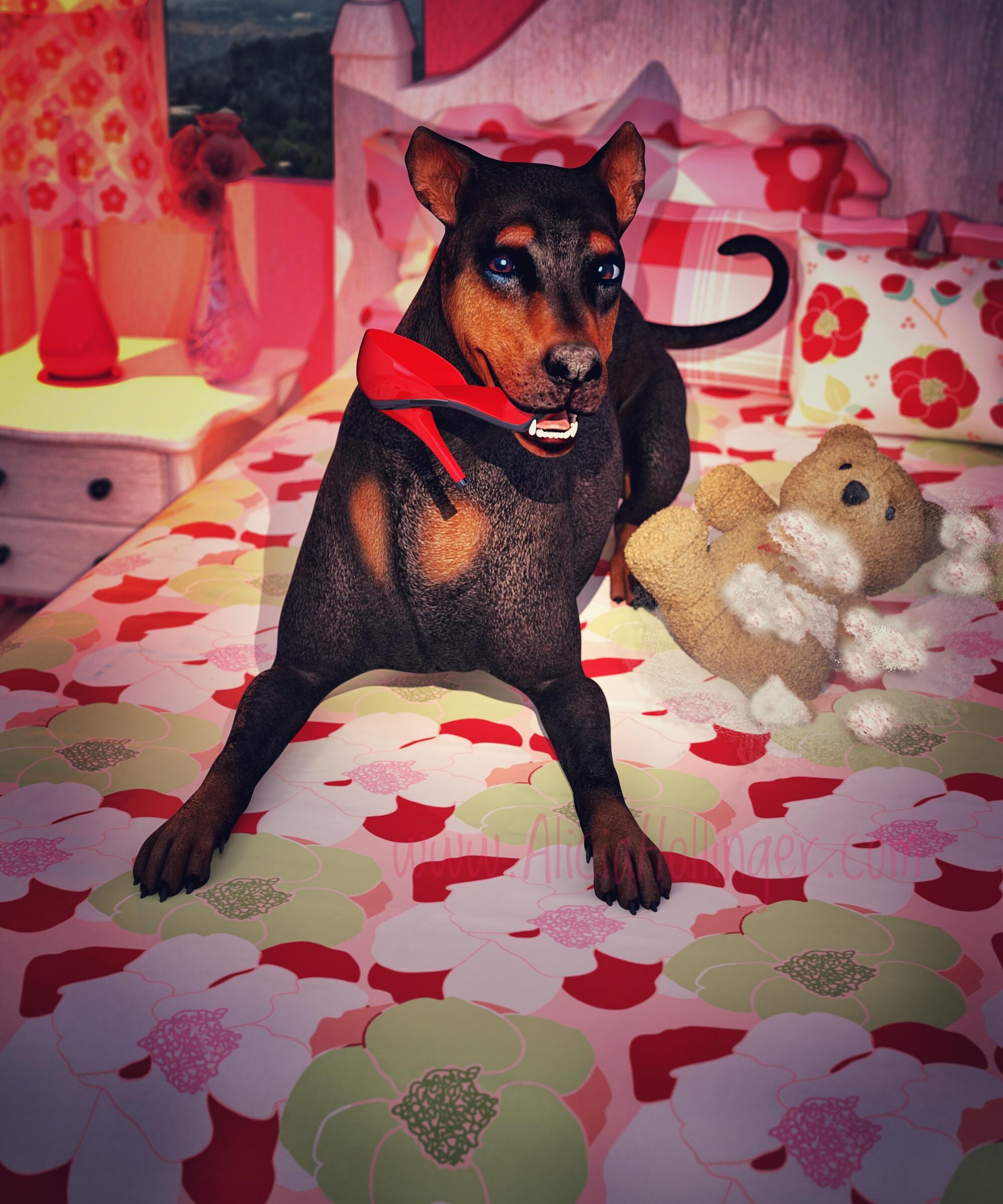 @barbult It is a full bedroom scene except the photo outside the window. I added a spotlight because the HDRI didn't pop enough and focus on the dog.  I wish there was a way to remove shadows. I tried lighting the lamp on the left with a warm point light but it did nothing for lighting really and I was hoping that would take away the shadow. I made the spotlight a bit warm so I was thinking one might imagine a lamp at the front door with a strong bulb out of frame. Is there a way to remove shadows??? If so, I couldn't find it...  I also did this pretty fast at about 3:AM and did postwork on my iPad in bed LOL. Now that I have a faster computer, I could try re-doing it, if you could give me tips on how to get rid of that shadow. Doing full scenes is new to me because on my CPU only computers, I would just render a character with a HDRI BG or add a BG later in PhotoshYou