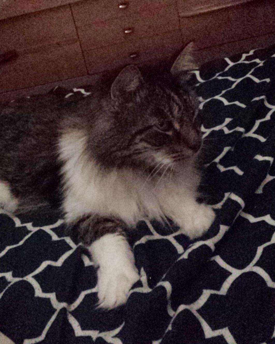 This is Ella and Dragon.  Ella is now about 13 1/2, she was born in our house, we owned both of her parents a well. she still runs and plays and will chase a squirrel across the yard full tilt.  Dragon is close to 18 he is a pound resuce, when we got him he was about 4 weeks old, not really weaned and his lttle legs were like toothpicks.  He was so fierce and determined to come through the bars of his cage and coime home with us.  We alos adotped another kitten the same day, Drake, but he passed away a couple years ago.  Not from the same littelr, Drake was about a month or two older.  He taught Dragon how to use the litter box and clean himself.