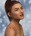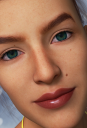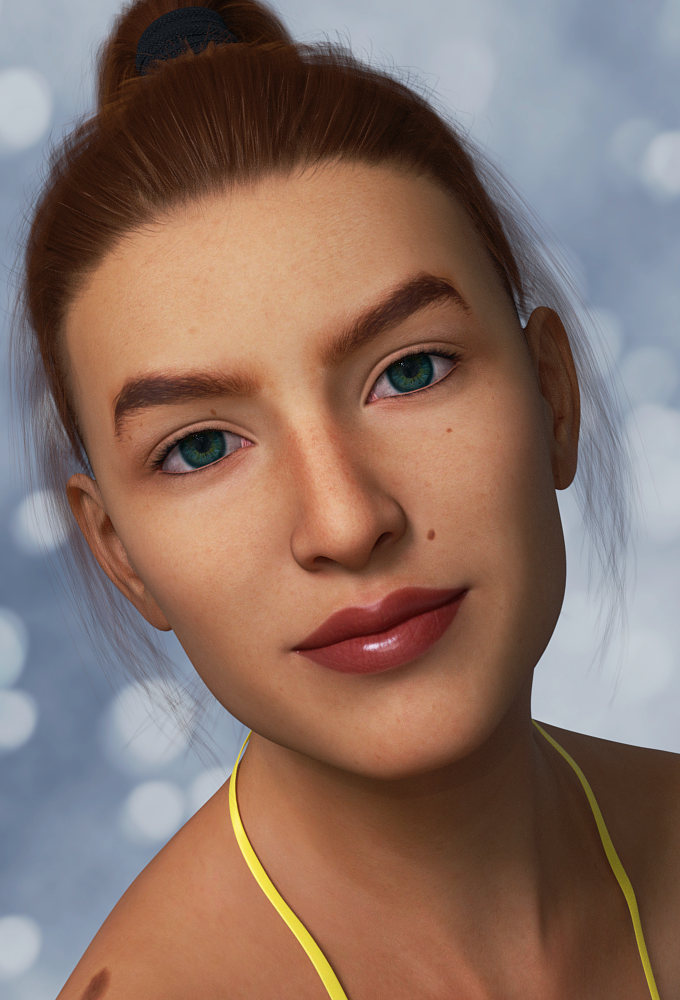 Shown is with my tweaks to the skin, with the increased metallicity, and increased reflectivity for the skin, etc. There's also more bump and reflectivity on the lips. That middle part between the sections on the top lip looks like it could be a bit off, though. Love the eyes! She has lovely skin to begin with, as you can tell.