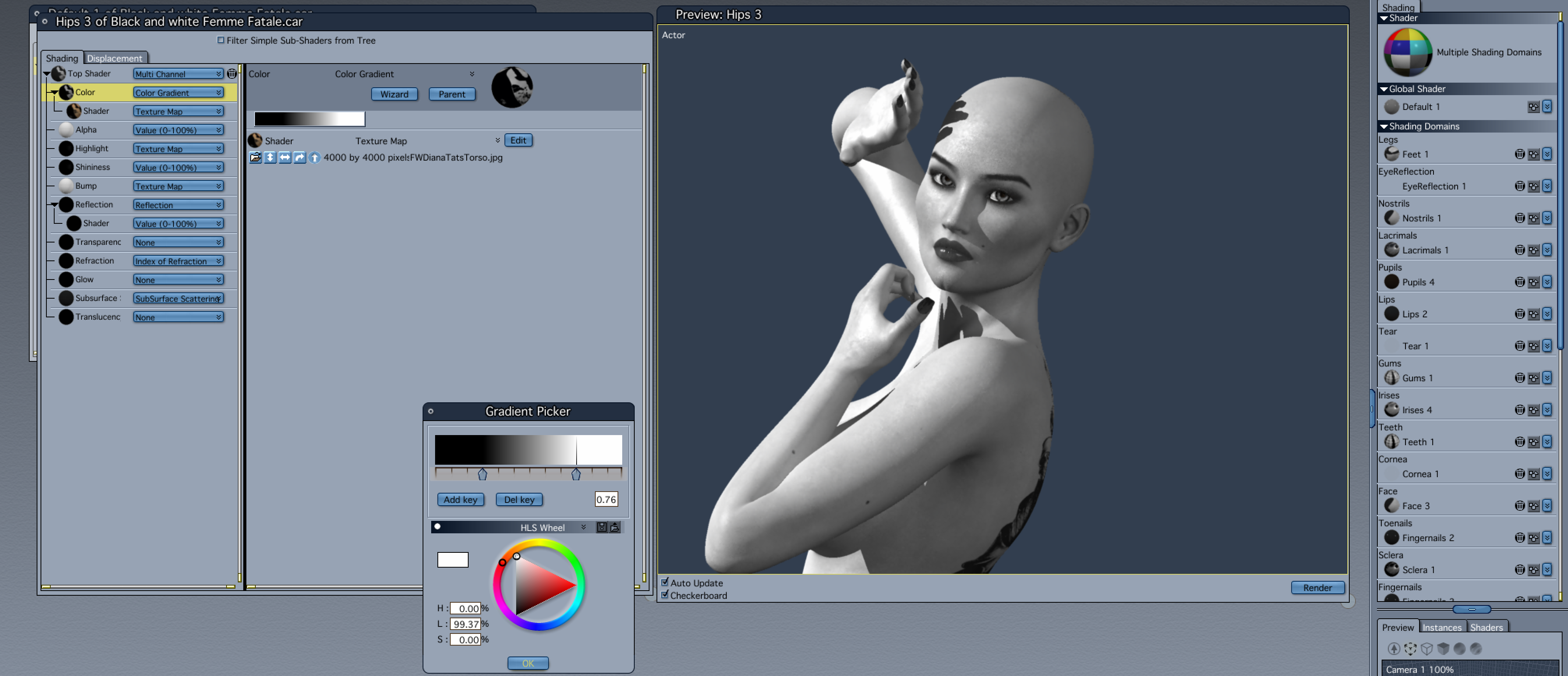 Thanks Headly! Did you see this post where I converted the color image maps to black and white by using a color gradient, and then doing that with every texture in the scene (except the red lingerie)? I was able to render that scene in black and white using Carrara's native renderer with no plugins or postwork.
