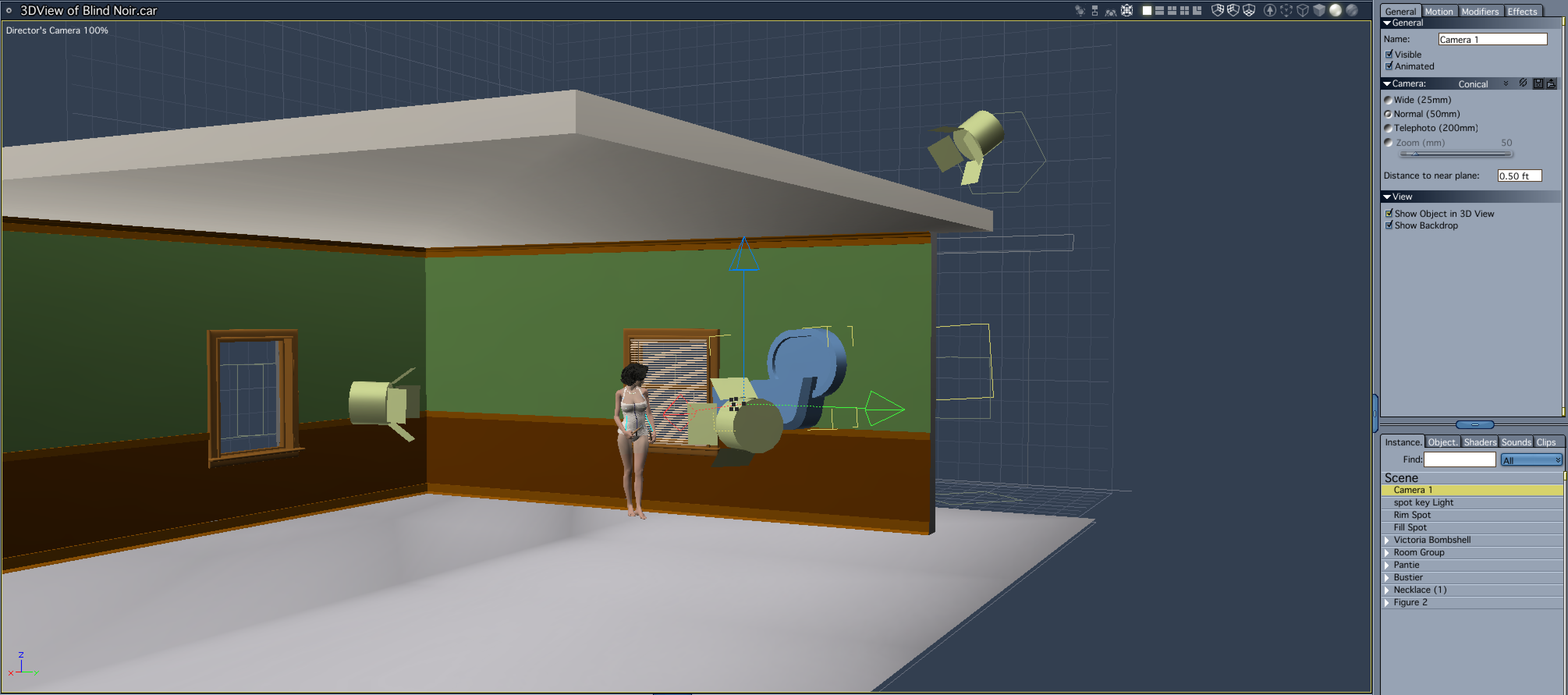 For the GI to work, I needed things like walls, floors, ceilings, etc. for the light to reflect off of. I built a wall with a window in the VM, and then duplicated it to make a room. I added a floor from another model, and blinds I found on ShareCG (sorry Andy, my wall with window was built to match the blinds I already had before your generous offer).