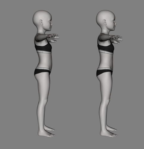 Just wondering, would it be possible to tilt the pelvis slightly forward for the younger ages, tuck it under a bit? One of the things I noticed with G2F/V6 is that her pelvis is tilted further back than any previous generation, possibly to make high heeled poses work better. However, if she's not wearing high heels, it makes her look swaybacked in all other positions.