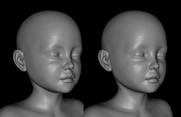 Glad to see I am not the only one that notices this. I always spend time in Zbrush fixing brows ands noses... these 2 features alone are what makes a child..... a child..... are those your images that are linked? If so congrats is in order. Both are really well done.