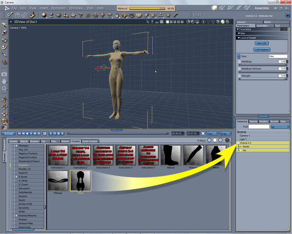 When you double click V4 in the scene,. Carrara thinks you want to edit the model,. so it opens V4 in the vertex modeller,.