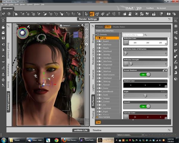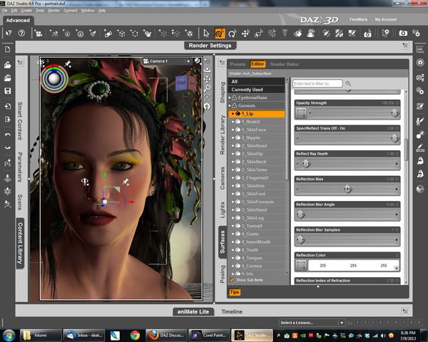 As for the glossy lips, these settings are in the specular section of the material pane. Lower glossiness settings actually spread the specular highlight across the surface of the lips, while higher numbers concentrate the highlight to a small tight circle. 100% and 0% are not favorable in either circumstance, they just don't seem to behave the way you would think.
