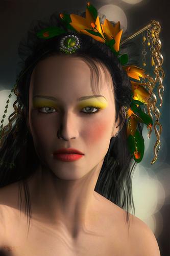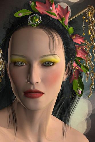 Well I didn't want to inundate you guys with pictures, so I wasn't going to post one until the end. The lips are a lot better. I figure with the type of lighting here, they look alright. And then I tried to use the ubersurface shader to make the flowers velvet, and now everything's a mess. LOL.