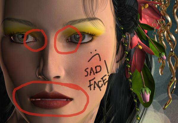I'm here about render issues. I've got this important lady I'm working on, and for some reason part of her lips and her lacrimals are just not there. Now I know so very little about the settings and didn't even get the old settings under my hat before DAZ changed things up so I can't even begin to know what settings to post here for you to see. I can tell you the diffuse settings look right, darn it. I double checked and tweaked textures and everything. But she insists on baring her teeth and not crying. I thought, okay the teeth are too far forward somehow and put their opacity to 0%. So then I got a strange gap.