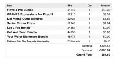 Anyone else not getting the discount?  I have a banner that says I get 20% off since I'm a supporter of the G8 product line.  So I put Floyd 8 Pro in the cart with 1 of the addon packs  (textures for the Leif Viking outfit), then went and put my free bundle in the cart.  Is it because I dumped my PC memebership when it expired a couple weeks ago?  Is that why the Floyd Pro back is still almost $80 in my cart?  And I have absolutely no discount for me on the Lief Viking textures.
