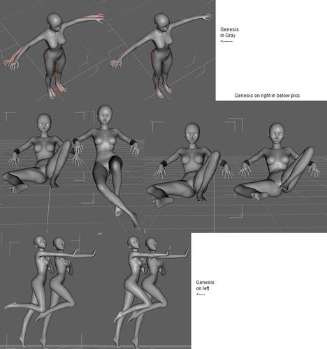 In any case, it make the pose on Genesis closer to the "intent" of the A3 pose, I think. There are some examples attached, which are also included in the download. Pics on the left are before, on the right are after. Thigh bends, abdomen and fingers are a large part of the changes.