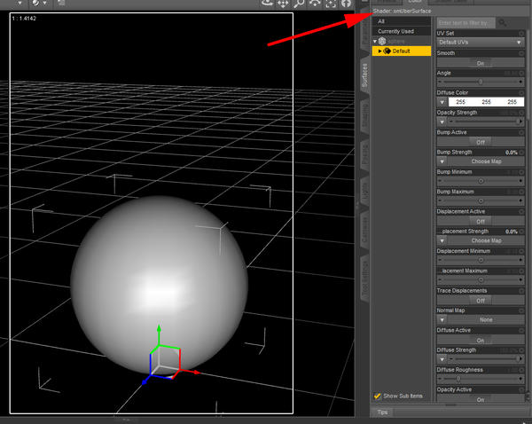 When you click on a surface in the Surfaces Pane the name of the shader will show at the top of the pane.