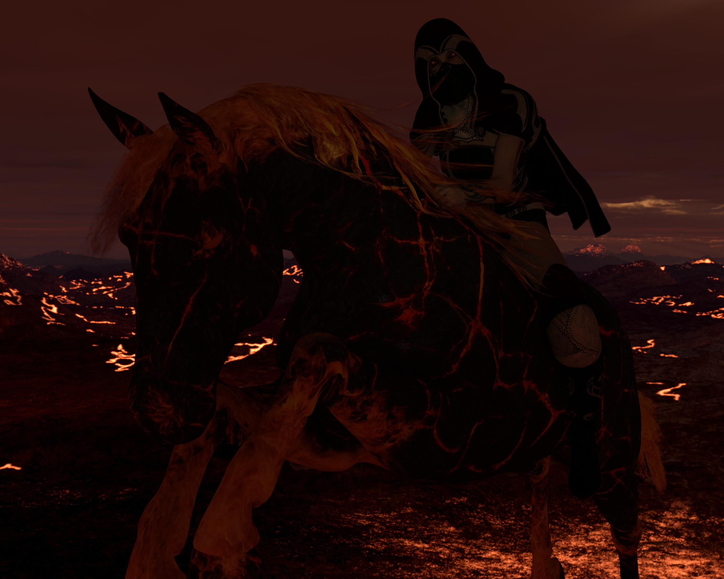 This is personal art.  I did the original render(s) very very late at night several days ago, and just finished the postwork on it tonight.  This one has been rattling around in my head since I picked up the hell horse several months ago.  I did three renders, then moved it all to photoshop. Rons brushes played a large part in this one lol. Definitely best viewed full size.