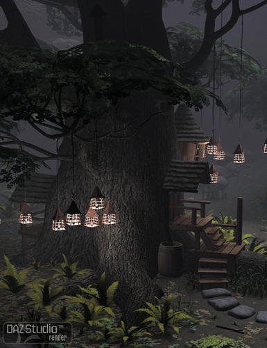 Mystic Hollow comes with an environment set for the hollow and a set for the tree with the tree house. There are also a number of individual props like a morphing mushroom, grass, lanterns, ferns, rock, to help add individuality to your scenes. There are two different textures for the tree house (natural and aged).