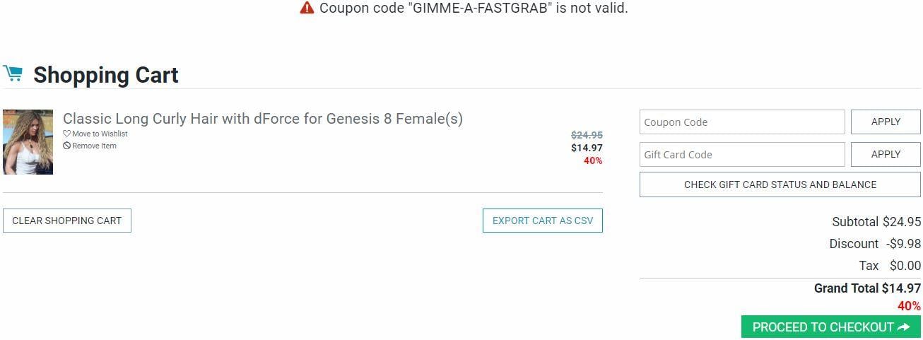 I've noticed, lately, that the sales banners and prices have taken a bit longer to switch over after Daz midnight than usual - I wonder if the codes taking a while to work might be related to that? Maybe a server or cloud thing?