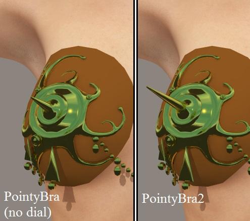 PointyBra changes the area at the base of the point the same way as PointyBra2, but adds a smaller spike.
