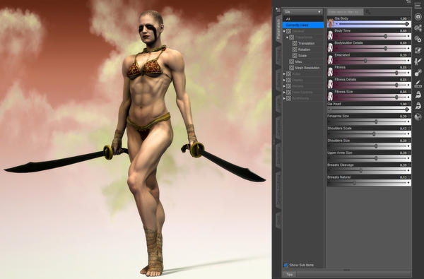 One more post regarding upper body bulk - here's the adjustments I made for this render to turn Gia into a swordmaster...