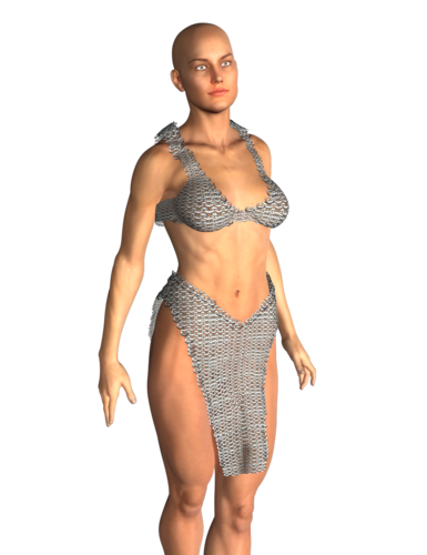 Did somebody ask for a metal bikini? So obviously this isn't the greatest render... In fact I might submit it as one of the worst (I put it together in about 5 minutes). However, I wanted to show off some of the versatility that Gia and the Genesis 2 Females have. I used Autofit to convert the V4 tunic to Gia (I had to use the V4 for Genesis 2 female to do the conversion, but there are ways around that). I used the Chain Mail Fantasies for V3 Sp chain mail textures on the tunic, and voila a chain mail bikini. Also she is bald because I was too impatient to wait for the hair to render.