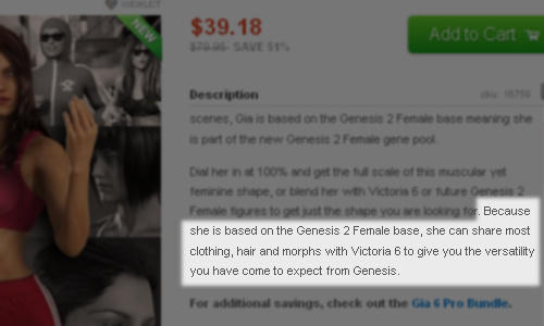 I think it is funny that they also put "can share most clothing, hair and morphs with Victoria 6" as if Victoria 6 was a separate figure and not 100% symbiotic morph of the same very base that you can dial in any proportion with or without Gia. Does that mean that Gia isn't comparable even with all G2F things? Promo certainly tells me she isn't, because "most" isn't "all".