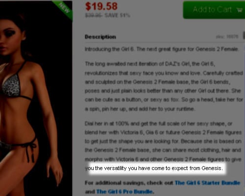 Today the Girl6 for G2F is out, before we see a single Genesis2 male figure from DAZ. And it also includes "to give you the versatility you have come to expect from Genesis" in the promo blurb, even though, unlike Genesis, the G2F base was deliberately designed to exclude half of the human race and thereby gives no more than half the versatility of Genesis, if that.