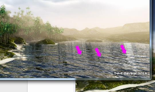 Now Dave, these lines here, that sort of drag down across the water surface are interesting. (don't get me wrong, it's an excellent render) but you probably guess by now that what the render engine does with materials is where most of my attention lies. And here, with these lines, it's a good example of what happens when the virtual normal generated by the bump provides a result that lies on the other side of the surface on which the material is applied (oh for parallax mapping - that would be high up on my wish list of Bryce 8) - dirty fast self occluding parallax mapping working off geometry normals. Anyhow, if you tinker with reflection correction you will find these lines will vanish and you will get instead of a view at 90 degrees to the geometry normal, a reflection instead, devoid of bump effect where the bump gets too extreme. Or lower the bump setting - in the range 10 - 0 it's almost impossible for the DTE to generate a value capable of breaking the mapping - I would have been more confident but since I unearth the extreme alpha output from DTE - even very low values can be made into virtual geometry breakers.