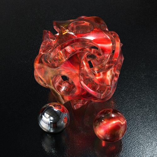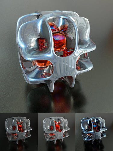 This is Funky Shape 404 and this is a special render, in fact, two of them. There was not enough light in the tubes so I rendered with David's Obscure Glow method, making the golden part glowing. This TA render was good but bump and contrast was somehow lost. So I rendered this once more with conventional IBL and got the dark tubes but great bump. I saved both rendered images as 48-bit TIFF and multiplied them to an HDRI which I processed with the Color Correction SSE plugin and finally tone-mapped this HDRI with a dynamic range of nearly 2.5 million to 1 using the global Reinhart operator. I think I got the bump and the light in the tube and all with a pleasing contrast. Total time to render and process less than one hour.