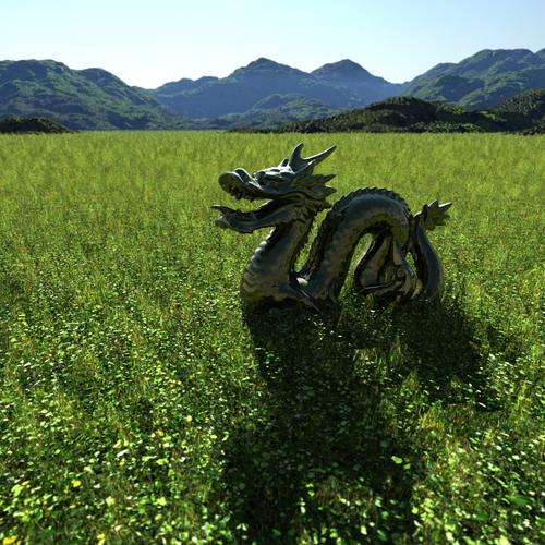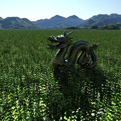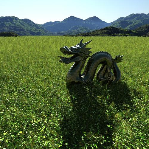 Horo, here without DOF. Not much to be gained in terms of speed, the AA pass is rather slow what with all the transparencies. Actual geometry in this scene, aside from the dragon, 4 x planes and 3 x terrains.